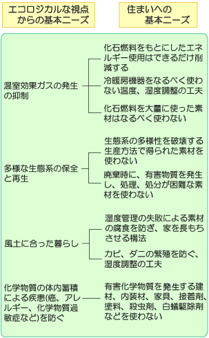 ■ナチュラル志向の人たちの住まいに対する基本ニーズと素材、技術の組み合わせ